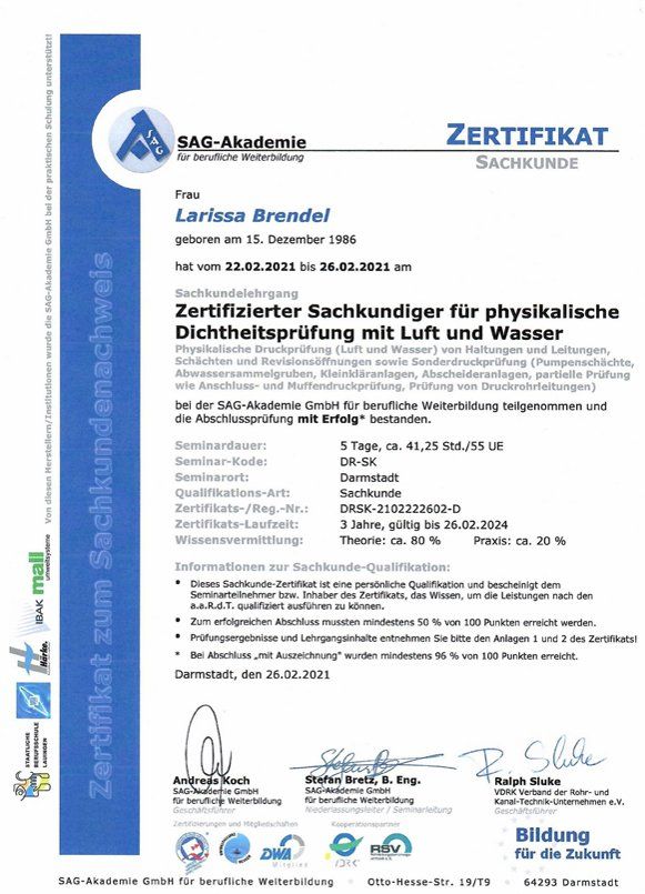 2021 habe ich dann die Schulung zur zertifizierten Sachkundigen für physikalische Dichtheitsprüfungen besucht und die Prüfung erfolgreich abgelegt.